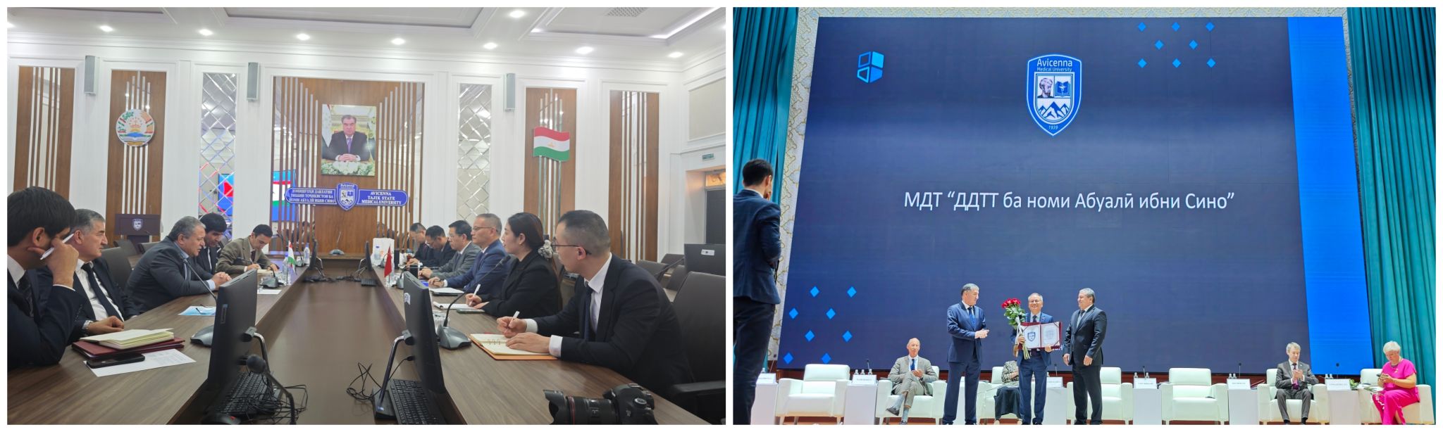 访问期间,代表团一行参加了阿维森纳塔吉克国立医科大学国际科学会议。塔吉克斯坦卫生与居民社会保障部部长阿卜杜罗佐达·贾莫利定等出席会议。高永翔教授代表中方团队作大会发言,向全体参会人员介绍了中国-塔吉克斯坦中医药中心的合作背景、进展和成果,以及伟德的基本情况,并欢迎参会嘉宾有机会到伟德交流合作。穆希丁校长代表阿维森纳塔吉克国立医科大学授予高永翔教授荣誉证书。