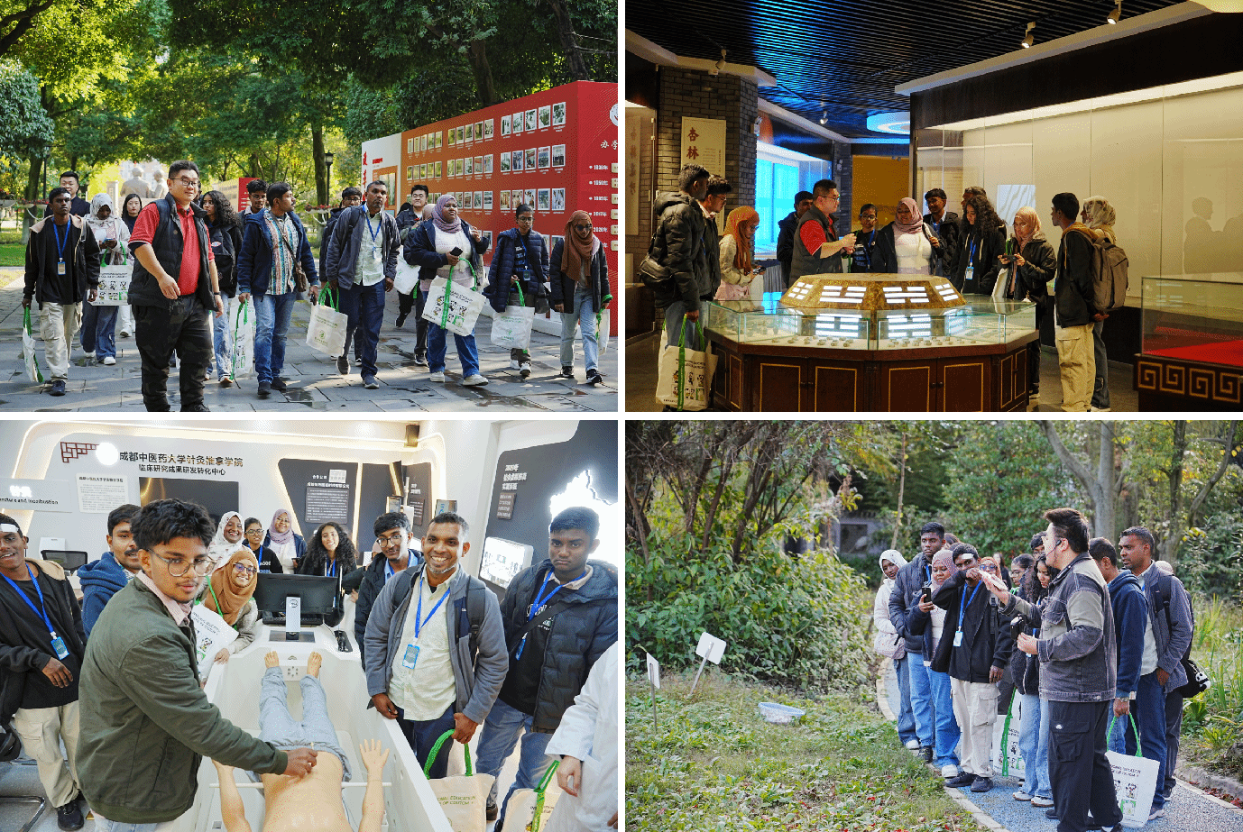 代表团一行通过校情介绍和留学生经验分享详细了解了伟德办学历程、学科优势和国际教育情况,通过走访学校中医药博物馆、针灸推拿学院临床研究转化中心、药用植物园等地,近距离接触中医药的博大精深和学校深厚底蕴,通过欣赏川派功夫茶艺展示、学习针灸推拿科普知识,沉浸式体验中华传统文化和中医药预防保健的独特魅力。