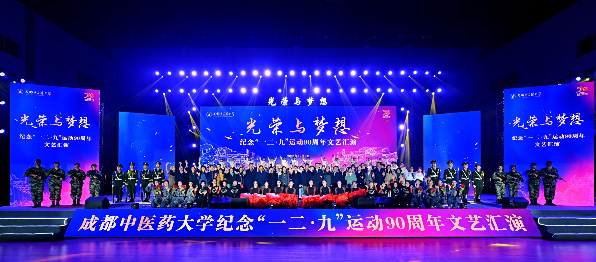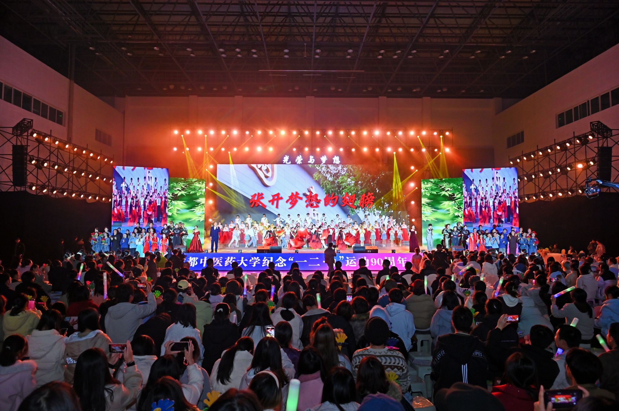 12月9日晚,学校在温江校区体育馆隆重举行“光荣与梦想”——纪念“一二·九”运动90周年文艺汇演。共青团四川省委副书记张志君,蜀道集团成渝高速副总经理黑比拉彝,校领导张泽钧、曾芳、杨静、郑学斌、国锦琳,学校各职能部门负责人、各学院领导、师生代表共计2000余人齐聚现场,共同回望革命先辈救亡图存的峥嵘岁月,传承爱国主义精神,凝聚新时代青年奋进力量。