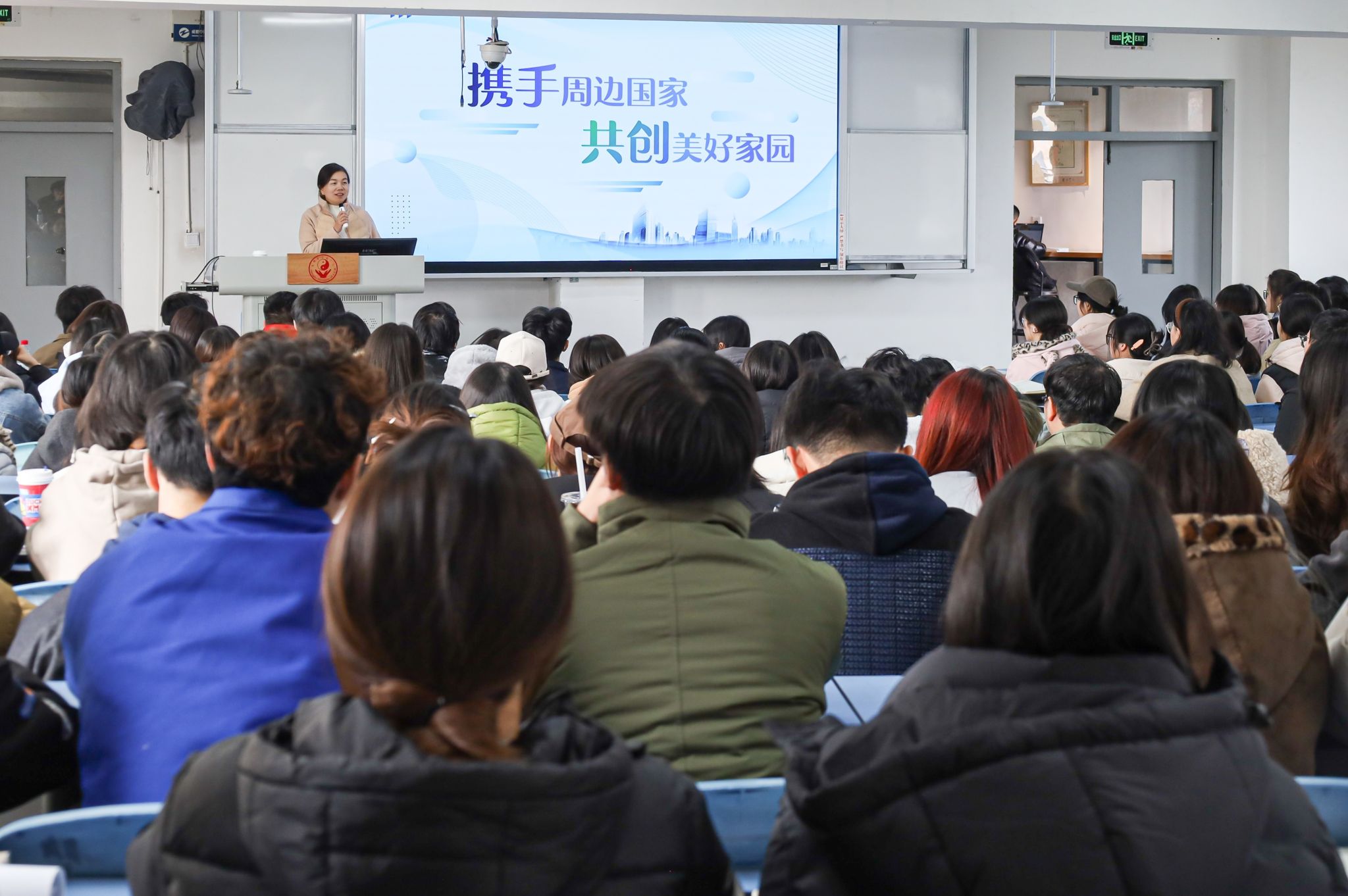 课程以2025年中央周边工作会议精神为切入点,从经济合作、安全格局、外交全局及构建人类命运共同体四大维度,系统阐释了周边地区在新时代中国外交中的核心地位。授课中,曾芳结合学校与塔吉克斯坦、泰国、俄罗斯等国高校的合作实践,生动展现了教育交流在服务国家外交大局中的桥梁纽带作用。针对“亲诚惠容”周边外交理念,曾芳通过生活化类比,深入浅出剖析其思想内核与文化根基,指出这一理念既植根于中华优秀传统文化,也传承发展了新中国周边外交宗旨,更精准契合中国与周边国家共促发展的现实需求和长远愿景。她依托翔实数据与鲜活视频资料,全面梳理新时代我国周边外交的历史性成就,强调在元首外交引领下,我国与周边国家的政治互信持续增强、互利合作不断深化、区域合作机制稳步落地、风险应对能力显著提升;并以中老铁路、中国-中亚峰会等标志性成果为实例,直观呈现了中国与周边国家携手共进的坚实步伐。