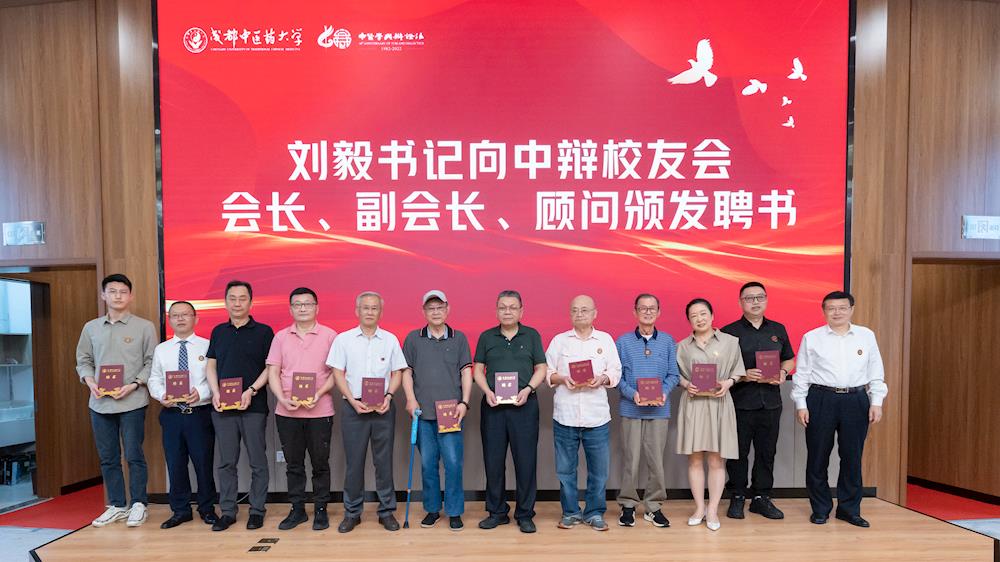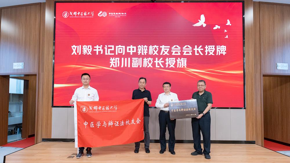 中辩校友会在纪念大会宣布成立,对外合作处处长佟枫宣读成立《中医学与辩证法校友会》成立批复及第一届理事会名单。刘毅向中辩校友会授牌并向会长、副会长及顾问颁发聘书,郑川向中辩校友会授旗。