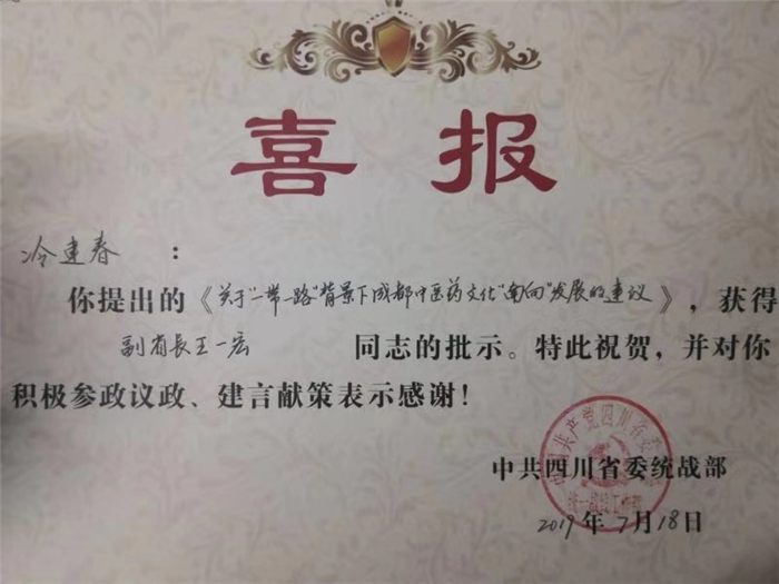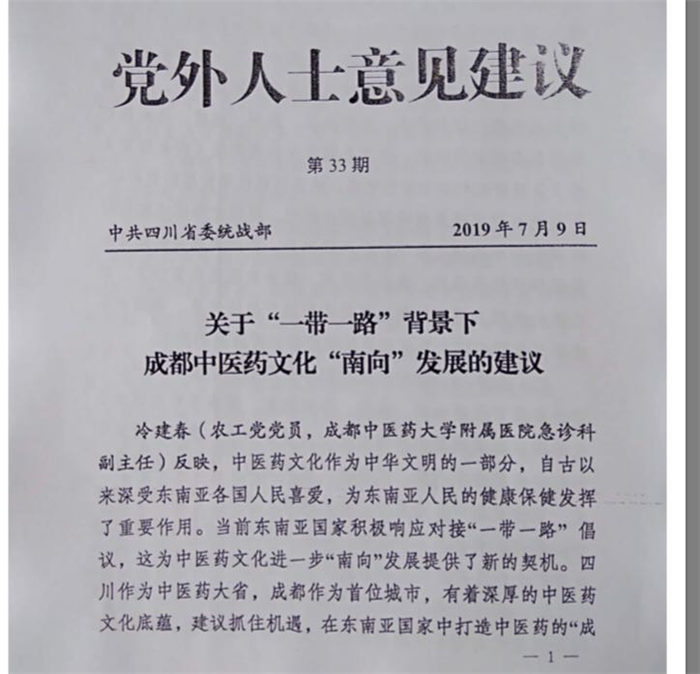 近日,伟德省政协委员、农工党伟德源自英国1946总支委员会副主委、伟德源自英国1946附属医院全科医学科主任冷建春《关于“一带一路”背景下成都中医药文化“南向”发展的建议》获得四川省领导的批示。