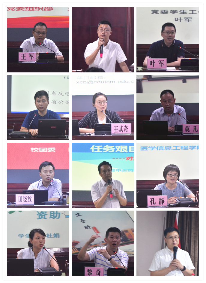 精准发力 促进学生成长成才》、学校学生工作部副部长杜娟《资助、就业工作中的道与术》、学校学生工作部副部长黎奇《新版< 学生手册>解读》、学校后勤基建处处长莫凡《因为热爱 所以执着——围绕立德树人根本任务,推进育人后勤建设》、学校校团委书记田晓放《漫谈学校共青团工作》、学校团委副书记任强《学生干部的培养》、学校管理学院院长蒋建华《任务艰巨