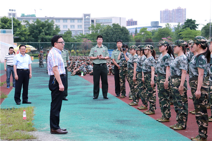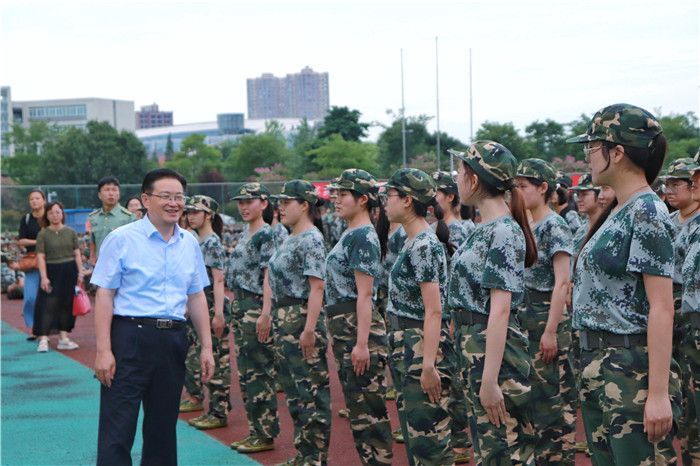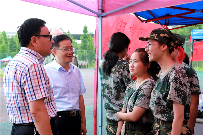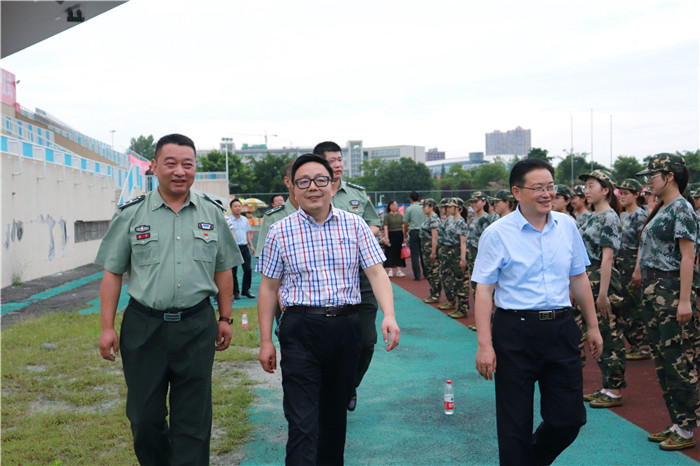 7月12日下午,学校党委书记刘毅、党委副书记沈涛在学校武装部、党政办、宣传部、学工部、校团委、纪检监察处等相关职能部门人员的陪同下,深入学生军训训练场,亲切看望并慰问在烈日下坚持训练和工作的2018级参训学生、教官和指导员。