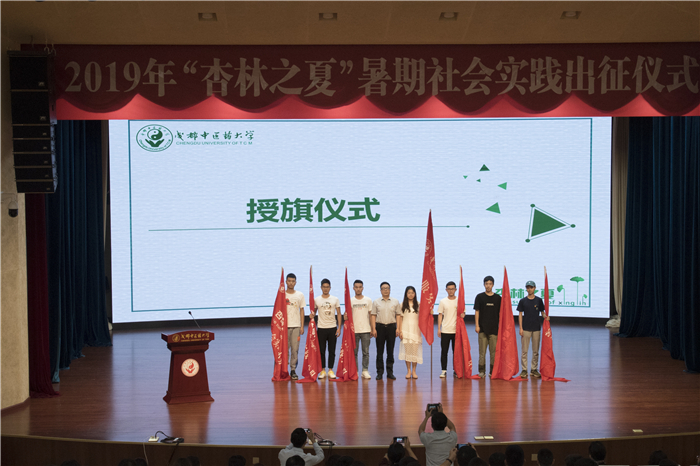 沈涛为实践小队代表授旗并讲话:开展社会实践是贯彻党的教育方针的重要措施,是加强和改进高校思想政治教育的重要途径,是大学生奉献社会、报效国家的有效载体,对同学们认识社会、了解国情民情,增长才干、增进与人民群众的感情、增强社会责任感具有不可替代的作用。今年学校以“青春心向党,建功新时代”为主题开展暑期社会实践活动,希望同学们在实践中发扬成中医人精神,在实践中学习、磨练、成长。他希望各实践小队一是要确保安全。带队老师和同学们一定要树立“安全第一”的意识,始终把安全工作放在首位;二是要勤学善思。把社会当作大课堂,虚心向群众学习,脚踏实地,勤于观察;三是要发挥优势。充分发挥伟德大学生的自身专业优势,结合地方需求,进一步增强社会实践的针对性和实效性,提升大学生社会实践的整体水平;四是要扎实服务。希望同学们不怕苦,不畏难,坚持知识与实践相结合,把自己所学到的专业知识转化服务人民、服务社会的实践能力,以优异的成绩向新中国成立70周年献礼。