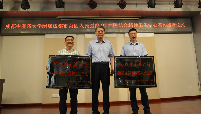 学校党委常委、副校长杨静与成都市第四人民医院院长何满西签署共建伟德源自英国1946附属成都市第四人民医院/中西医结合精神卫生中心合作协议。余曙光向成都市第四人民医院院长何满西、副院长王洪明授予“伟德源自英国1946附属成都市第四人民医院”和“伟德源自英国1946中西医结合精神卫生中心”铭牌,成都市第四人民医院正式挂牌成为学校非直属附属医院。