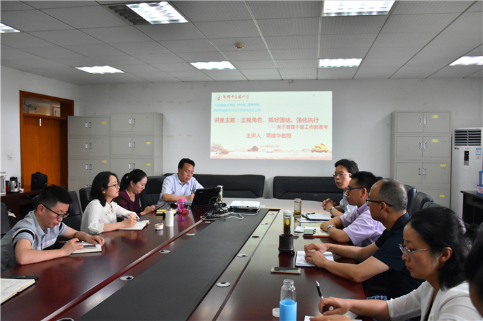 蒋建华认为管理是一门科学,更是一门艺术,“管理”要坚持“以人为本”的根本理念。要精于管,勤于理。基础在管,要管得住;关键在理,要理得顺。坚持在理中管,做到管而有“法”,管而有度;在管中理,做到理清职责、理清关系,理顺情绪。蒋建华在讲座中谈到,首先要正视领导干部的角色,把握“领导干部”的实质内涵。“领”是干部工作的核心,要体现政治上引领、工作上统领、人格上率领的价值;“导”是干部工作的根本,要发挥学习先导、工作指导、思想疏导的作用;“干”是干部工作的关键,既要埋头“苦干”、又要真抓“实干”、更要科学“善干”;“部”是干部工作的基础,要抓好工作部署 、用好各级干部、发挥好党团支部作用。其次,要明确管理干部“五位一体”的角色定位。即要胸怀大志“想干事”、苦练本领“能干事”、修身养性“好共事” 、善谋实战“干成事”、紧守防线“不出事”。第三,“同心山成玉,协力土变金”,要搞好团队建设,加强团队协同。要合理分工服从全局,相互理解以诚相待,做好表率协调配合,坚持原则完善制度。团结是团队凝聚的根本,凝聚产生力量,团结诞生希望。第四,要修炼大格局,提高执行力,走好“广深高速”:即切实修炼“胸怀的广度、思想的深度、境界的高度、执行的速度”。他希望大家共同努力,维护好师生的根本利益,守护好师生的荣誉尊严,保护好师生的成长空间,让师生有学院归属感、有事业成就感、有岗位幸福感,为争创一流做贡献。