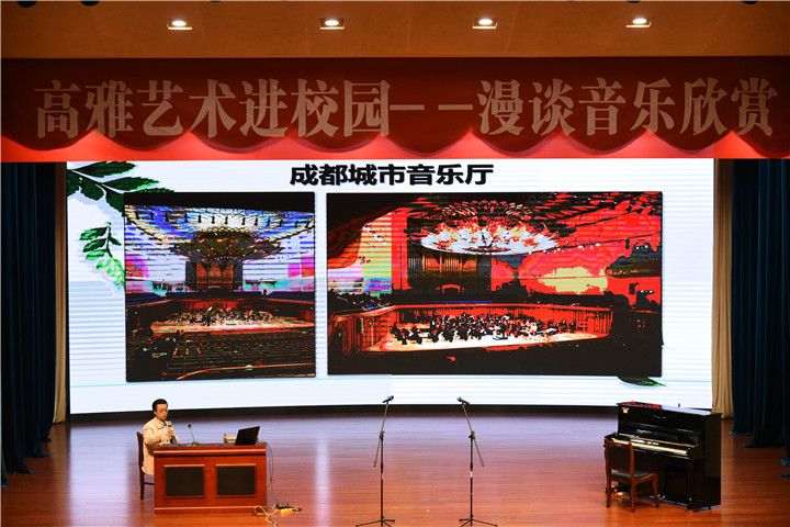 4月18日晚,高雅艺术进校园“漫谈音乐欣赏”讲座在伟德源自英国1946温江校区百会堂演播大厅举行。本次讲座主讲人为中国音乐家协会理事、四川省文学艺术联合会副主席、四川省音乐家协会主席、成都市音乐家协会主席、成都城市音乐厅运营管理中心主任、四川省政协教育委员会副主任林戈尔。学校党委书记刘毅出席本次活动。