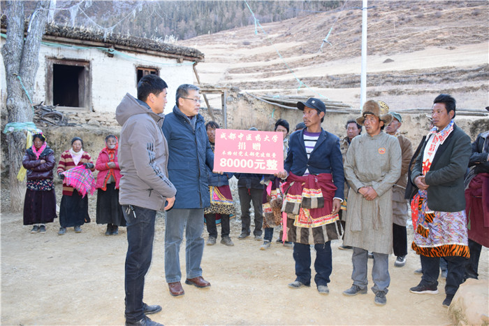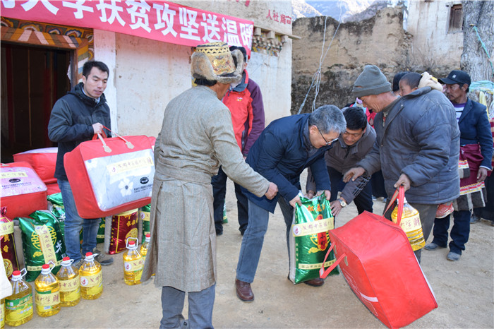 12月8日,余曙光一行沿着平均海拔3400米的陡峭山路驱车抵达木格村,正值严寒季节,高原满地冰霜,工作组抵达木格村赓即开展扶贫送温暖活动,看望困难藏族群众和驻村扶贫干部,表达全校师生员工对扶贫驻村干部的关心问候,勉励全村干部和困难群众,要不忘初心,坚定信心,齐心聚力攻坚克难,力争2019年全村脱贫。在活动现场,学校向木格村党支部捐助了8万元的党建经费,为全村18户困难群众送上过冬的慰问品,确保群众温暖过冬。