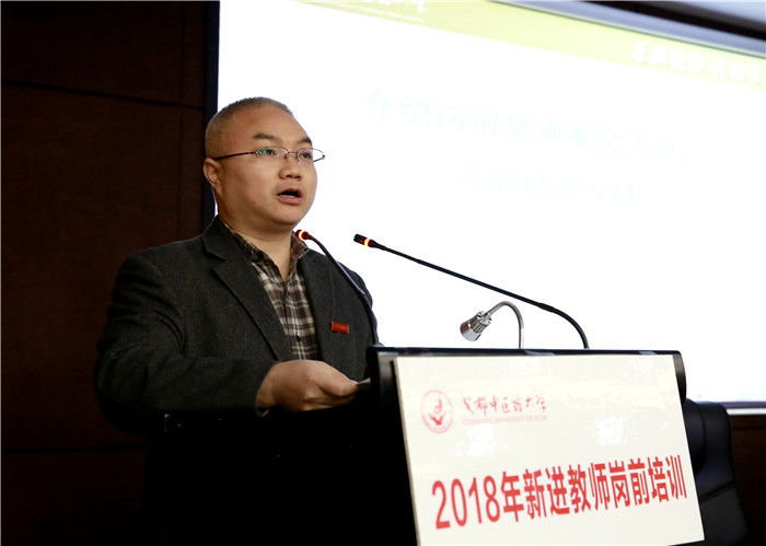 杨胤清代表学校对全体入职教师表示热烈的欢迎。他介绍了新进教师培训的情况和意义,指出教师是国家发展的第一资源,校内岗前培训是新教师的必修课,是新教师了解校情、明确使命、提升技能、实现专业发展的重要途径。教师代表、针灸推拿学院新进师资博士后孙睿睿代表2018年全体新进教师发言,她表达了进入成中医的喜悦以及对教师这一职业的理解,并倡导全体新进教师用心参与学校组织的岗前培训,秉承厚德博学、精思笃行的校训精神,为学校的发展发光发热。