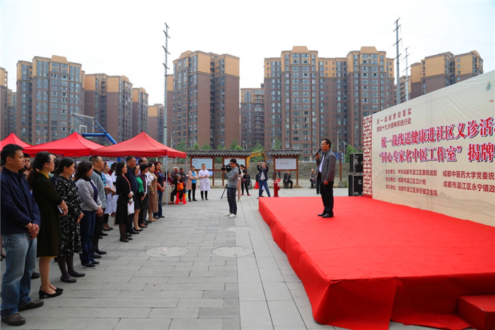 4月26日上午,学校同心专家服务团“中医药健康进社区”义诊活动暨“同心专家名中医工作室”揭牌仪式在温江区永宁镇田园花篱社区举行。学校党委常委、统战部长王军,温江区委常委、统战部长冯静出席仪式并发表讲话,共同为“同心专家名中医工作室”揭牌。学校和温江区部分民主党派基层组织负责人、社区群众代表等约100人参加仪式。