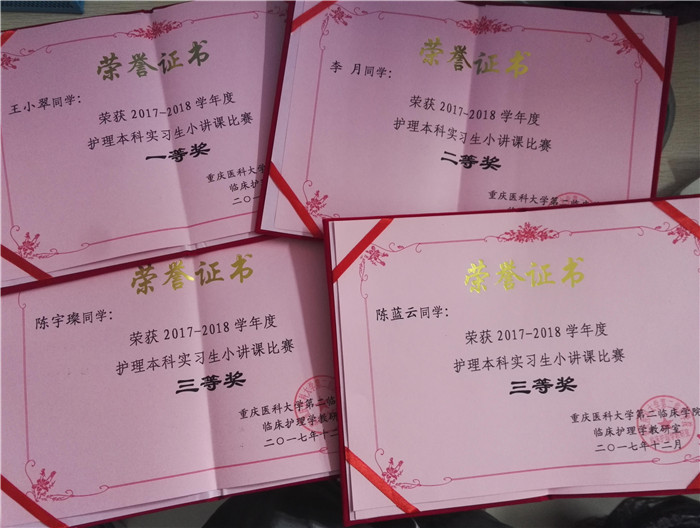 12月19日,伟德在重庆医科大学附属第二医院实习的护理学2014级学生,在参加医院举办的2017-2018学年度护理本科实习生小讲课比赛中获得好成绩。