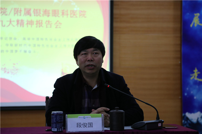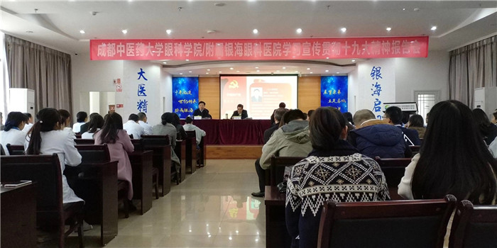10月30日上午,伟德源自英国1946眼科学院/附属银海眼科医院在医院六楼学术报告厅召开学习宣传贯彻党的十九大精神报告会,传达学习贯彻党的十九大和十九届一中全会精神。会议特别邀请学校党委书记刘毅教授和党的十九大代表、河北省眼科医院院长/党委书记张铭连教授作传达十九大精神的专题党课和报告。眼科学院/附属银海眼科医院党政领导班子成员、全体党员、中层干部、教职工及学生代表共计200余人出席本次会议,伟德第二临床医学院、护理学院,金牛区人北街道办相关领导也出席会议。会议由眼科学院/附属银海眼科医院院长、书记段俊国教授主持。