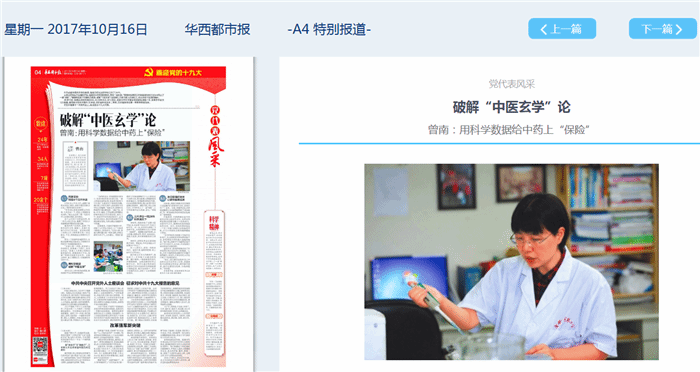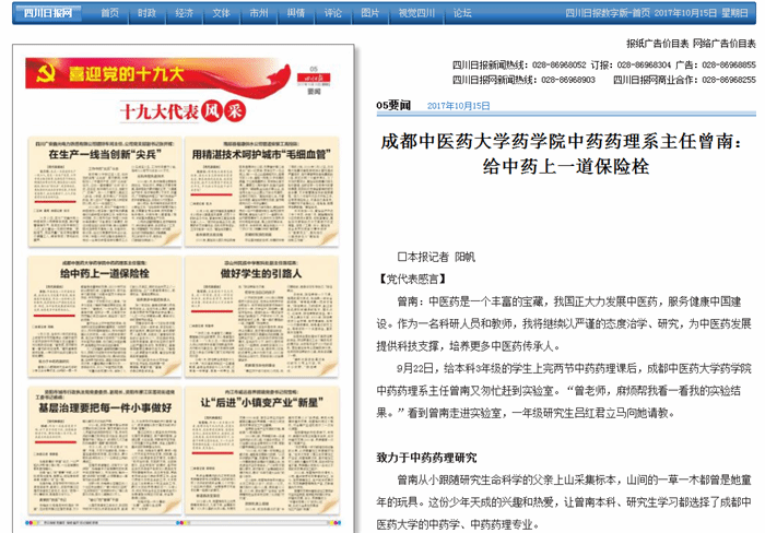 中国共产党第十九次代表大会将于10月18日在北京隆重召开。作为全省23个基层一线代表之一,以及四川省属高校唯一的代表,伟德药学院中药药理系主任曾南教授将随四川团赴京参加本次盛会。这既是曾南教授个人的荣誉,也是学校的荣誉,还是我省高校和中医药行业的荣誉。近日,《中国中医药报》《四川日报》《成都商报》《华西都市报》、新华网、四川新闻网、四川在线等媒体纷纷来校采访曾南教授,于10月14日开始陆续在各媒体十九大专题报道中推出代表风采。