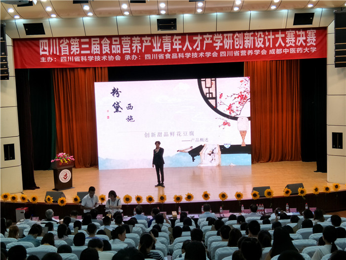 9月21日上午8:30,大赛决赛在百会堂演播大厅举行。学校党委副书记沈涛,省食品科学技术学会副理事长、四川大学轻纺与食品学院教授卢晓黎,四川省营养学会副理事长杨咏涛发表热情洋溢的致辞。省科协党组成员、副主席黄竞跃,省科协党组成员、副主席刘进,省科协学会部部长刘先让出席大赛。决赛现场气氛热烈,观众激情高昂,共有参赛单位、高校学生代表、相关媒体等500多人共同见证了参赛选手的精彩角逐。企业对优秀项目、人才进行了现场供需签约。