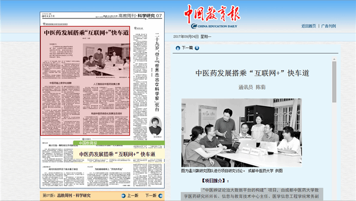 9月4日,《中国教育报》再次关注伟德科学研究工作,以《中医药发展搭乘“互联网+”快车道》为题,大篇幅报道由信息与教育技术中心主任温川飙带领研究团队完成的“中医辨证论治大数据平台的构建”项目,向广大读者展示了中医药文化的博大精深,增强了中医人学好用好中医药的自信。