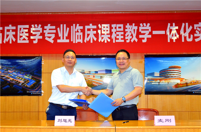 麦刚致欢迎辞并介绍德阳市人民医院概况。刘旭光与麦刚代表双方签订教学合作协议。廖珊对伟德本科生临床理论教学和德阳市人民医院的成功合作表示祝贺并作重要讲话,她认为此举是深化医学教育改革、输送更多优秀医生、推进健康中国的重要举措。