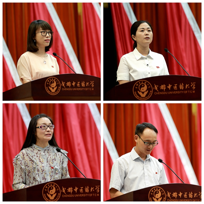 大会举行了先进典型交流发言。先进基层党组织代表、管理学院党委2013级学生党支部书记李韵涵以《用心培育、服务当先,充分发挥支部育人作用》为题,优秀共产党员代表、药学院科研测试中心研究员李芸霞以《时刻牢记党员身份不忘初心不懈奋斗》为题,优秀党务工作者代表、机关党委第一党总支组宣支部书记王其奇以《“小书记”有“大责任”:以党建标准化落实全面从严治党要求 》为题,优秀党建特色项目负责人代表、后勤党总支党建特色项目负责人杨永成以《走进后勤助力成长》为题,相继上台发言。