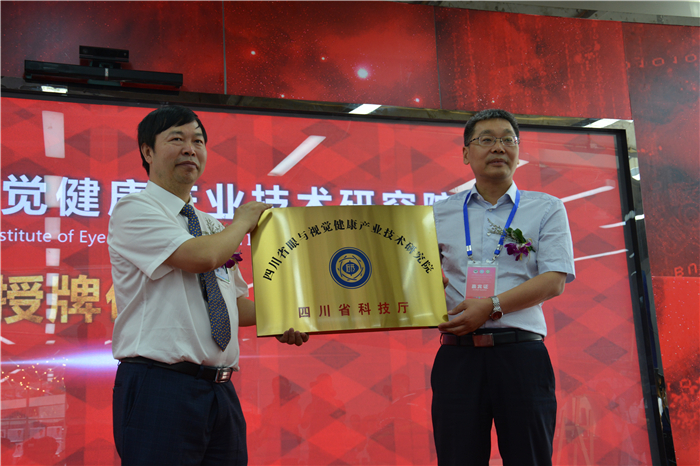 随后,举行了“四川省眼与视觉健康产业技术研究院”的授牌仪式。眼与视觉健康产业技术研究院是经四川省科技厅批准,由成都中医大银海眼科医院牵头,联合长虹、太极、西藏药业、和生视界、苏州微清和欣亿康共建的针对眼科领域医疗设备与器械研发、药品食品研发,医疗服务能力提升及视光产品研发等眼健康全产业链的集创新研发、成果转化、企业孵化、楼宇制造产业化为一体的产业技术平台。余曙光校长代表省科技厅向银海眼科医院院长段俊国授牌。