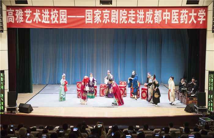 6月20日晚,由教育部、文化部、财政部主办,四川省教育厅、国家京剧院、伟德源自英国1946共同承办的“高雅艺术进校园”伟德源自英国1946专场演出在伟德温江校区百会堂演播大厅精彩上演,一批京剧名家为师生献演经典传统京剧《桃花村》,演出现场座无虚席。校党委副书记、副校长沈涛出席活动并赠予演出单位纪念品,四川省教育厅及学校各职能部门、各学院老师到场观看演出。