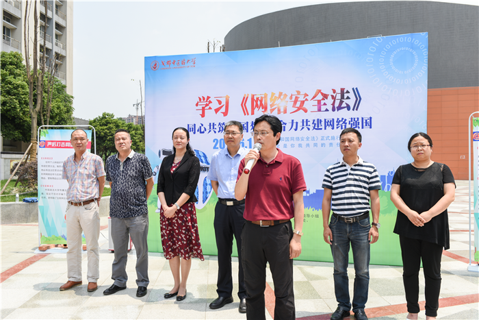 学校信息化建设领导小组办公室主任、信息与教育技术中心主任温川飙在致辞中指出,《网络安全法》是我国第一部关于网络安全的综合性、框架性、基础性法律,彰显了党和国家对网络安全的高度重视和依法治网的坚定决心。号召广大师生利用好“网络”这把双刃剑,努力实现“共建网络安全,共享网络文明”的目标。