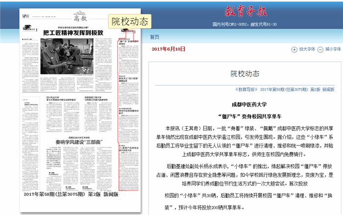 日前,由学校后勤基建处推出的“僵尸车”改装版共享单车首批30辆投入使用。此举以践行绿色发展新理念,解决校园“僵尸车”停放占道、闲置浪费等问题,变废为宝,倡导勤俭、环保的文明生活方式,受到媒体广泛关注,“小绿车”迅速走红。截止6月10日,四川新闻网、四川在线、中国网四川频道、《教育导报》等多家媒体来校采访报道。