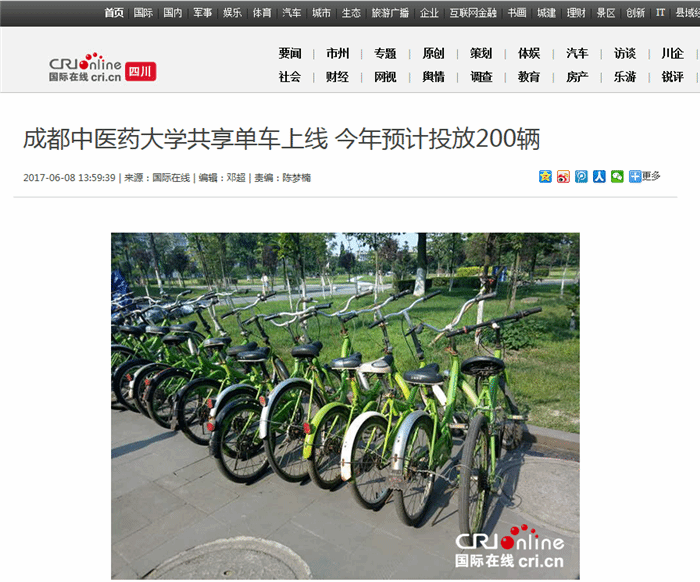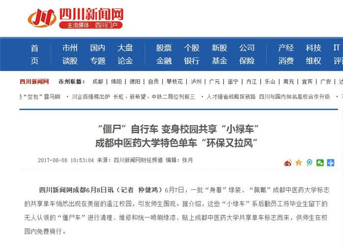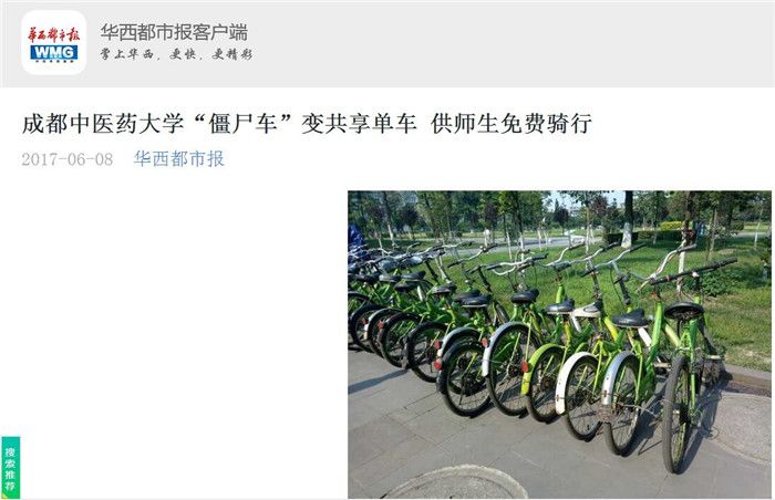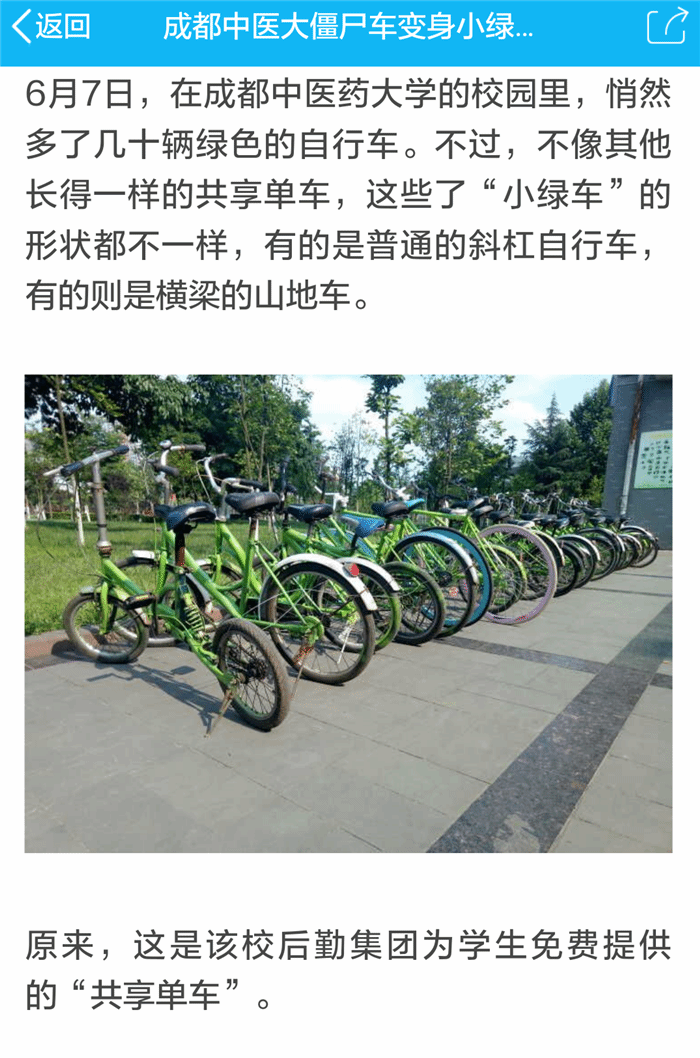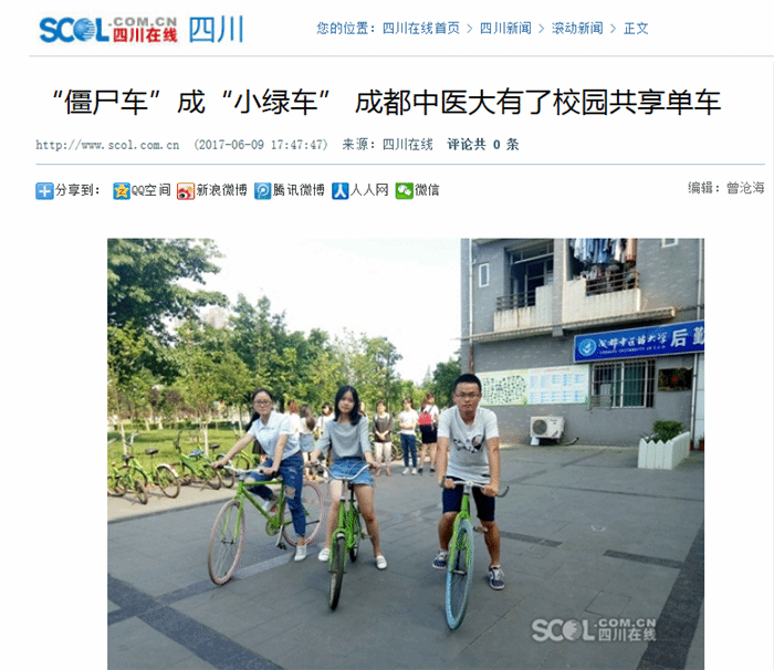 内容:“僵尸车”成“小绿车” 成都中医大有了校园共享单车