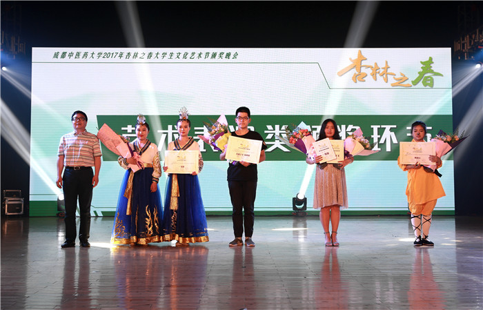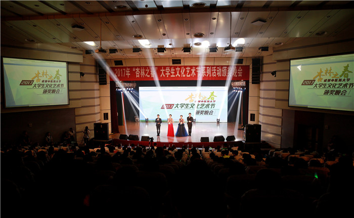 6月12日晚,由宣传部、学生工作部、校团委主办的2017年“杏林之春”大学生文化艺术节颁奖晚会在百会堂举行。校党委副书记、副校长沈涛出席晚会并颁奖。学生工作部部长叶军,宣传部副部长罗晓文,校团委书记田晓放,各学院学生工作分管领导、学生科科长、分团委书记等参加晚会。成都市学生联合会执行主席,四川大学、电子科技大学、四川农业大学等兄弟院校学生会主席,参加川渝高考学子中医药文化体验营活动的40名高考学生代表等校外嘉宾应邀观看了晚会。