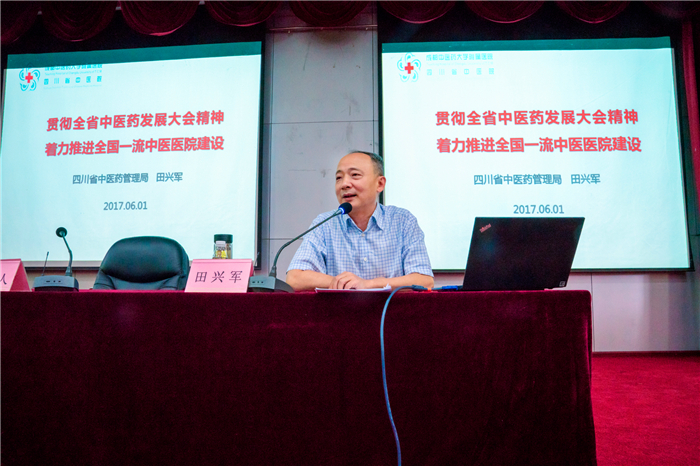 6月1日,四川省中医药管理局党组书记、局长,省中医药科学院党委书记,省卫生计生委党组成员田兴军受邀,到伟德临床医学院/附属医院作题为《贯彻全省中医药发展大会精神 着力推进全国一流中医医院建设》的专题报告,并看望医院专家与医护人员。报告会由院党委书记杨静主持。