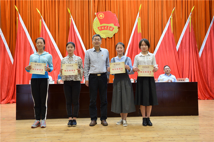 大会隆重表彰了2016-2017年度学校五四红旗团委、校长特别奖、国家奖学金、国家励志奖学金、自强之星、五四红旗团支部、优秀团干部、优秀团员、优秀志愿者组织、优秀志愿者项目、优秀志愿者、星级社团、社团工作先进个人等奖项。学校党政办主任张希,组织部部长王军分别宣读了表彰决定,与会校领导为获奖集体和个人颁发了奖牌和证书。