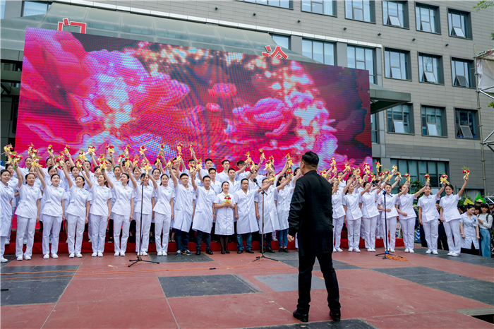 医患情深,一位7年前患肺癌在医院肿瘤科治疗康复后的患友,来到现场,深情舞蹈《爱的奉献》,为医护献花,感谢医护人员给了她第二次生命。