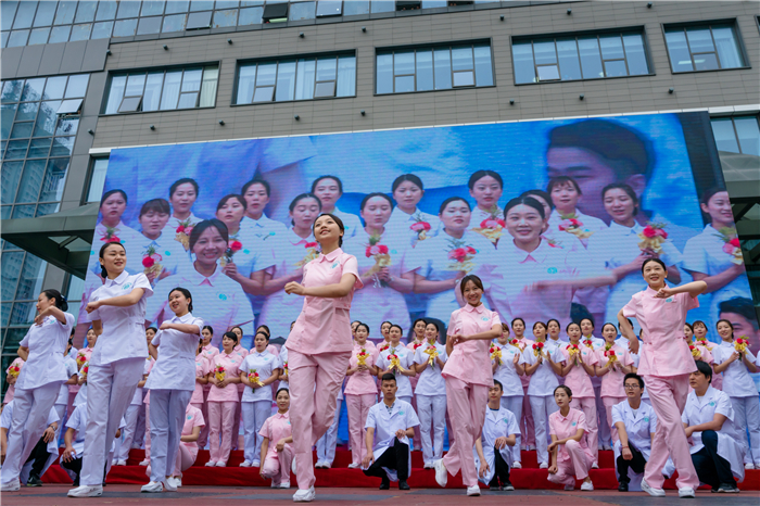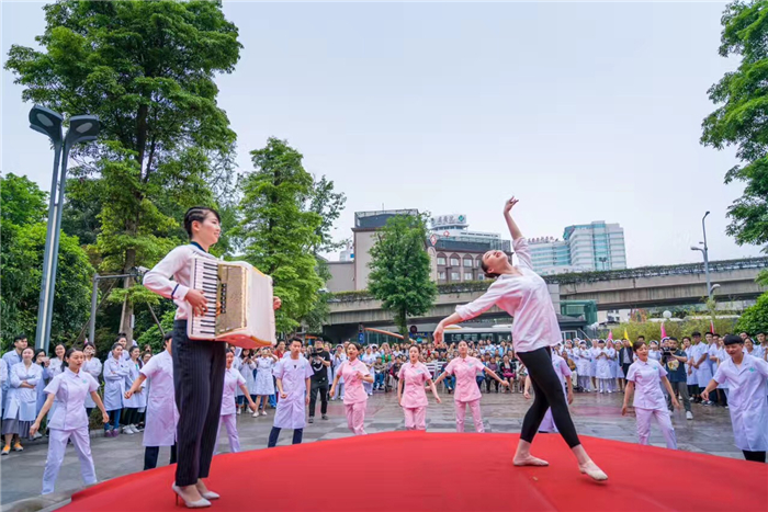 悠扬的手风琴音乐,伴随60多位医护员工的舞蹈与传统武术,“快闪”表演在门诊大厅拉开序幕。活动首次采用了同步大屏幕直播,从门诊大厅贯通于文化广场,现场气氛热烈。