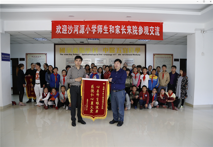 沙河源小学校长季志彬代表沙河源小学全体师生向医院赠送了题为“心系师生眼健康,医德仁心显大爱”的锦旗。沙河源小学家委会代表全校学生家长向医院赠送了题为“光明使者,传递爱心”的锦旗。