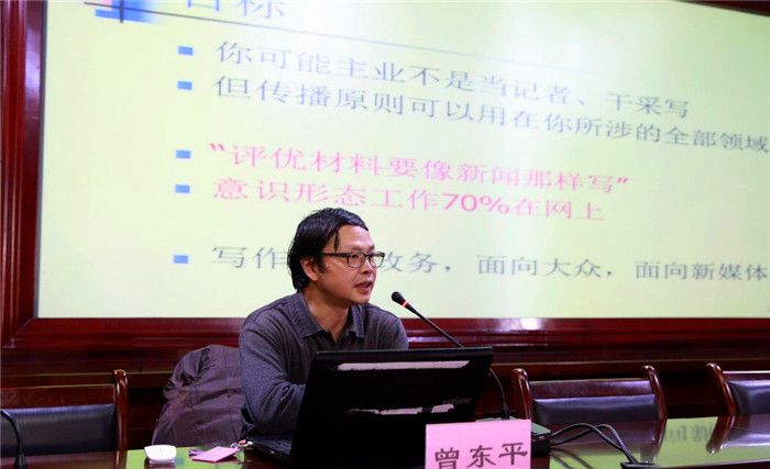 学校举行宣传工作业务培训会 发布时间:2016-12-22 10:05:00 浏览次数: 次 【字体:小 大】 12月21日下午,学校宣传工作业务培训会在温江校区行政楼第五会议室举行,四川日报《川报观察》客户端主编曾东平应邀为宣传部工作人员和学校全体宣传员作培训讲座。培训会由党委宣传部部长赖玉萍主持。 曾东平以自己长期在新闻工作第一线的经验为基础,以现代传播学理论为指导,结合大量生动贴近的案例,以新闻的特性和价值、新闻工作者的追求与素质、写好新闻的方法等论题为主要内容,并通过让大家修改稿件、选择图片等互动方式,为大家作了一场丰富精彩的新闻宣传业务培训。 (文/校报记者站 张宇 图/庞利红 编辑/刘承云) 【打印正文】 上一条:学校举行宣传工作业务培训会 下一条:伟德被评为成都市武术运动协会先进单位