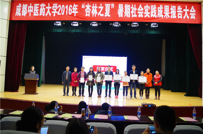 11月17日下午,学校2016年“杏林之夏”暑期社会实践成果报告大会在百会堂演播大厅举行。学生处、校团委、针灸推拿学院、医学技术学院、医学信息工程学院相关领导和老师及得荣县人大常委会主任阿郎出席了报告会。来自各实践小分队的代表及四川农业大学学生代表近400人参加了会议。