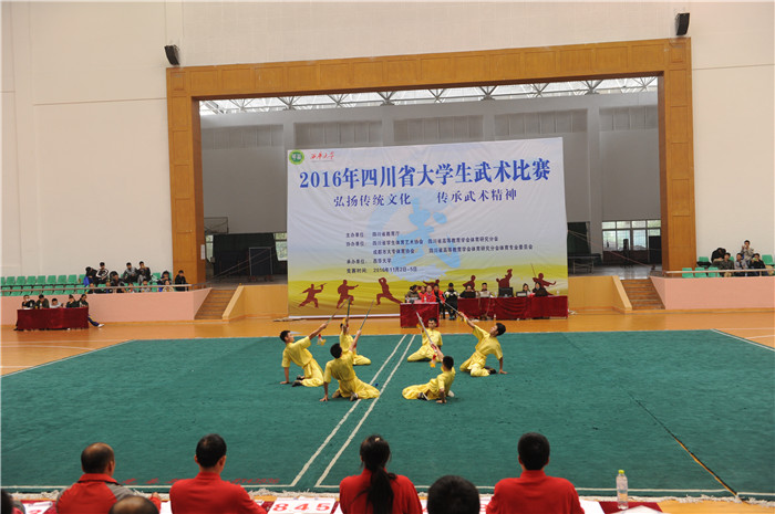 11月2—5日,由四川省教育厅主办、西华大学承办的2016年四川省高校武术套路比赛在西华大学体育馆顺利举行,来至全省28所高校的300多名运动员参加了比赛。伟德派出由体育学院副院长谢卫任领队、武术教研室教师李光惠、鄢显明、陈孝慧、郑贞任教练,和26名来至不同学院的学生组成的代表团参加了本次比赛。
