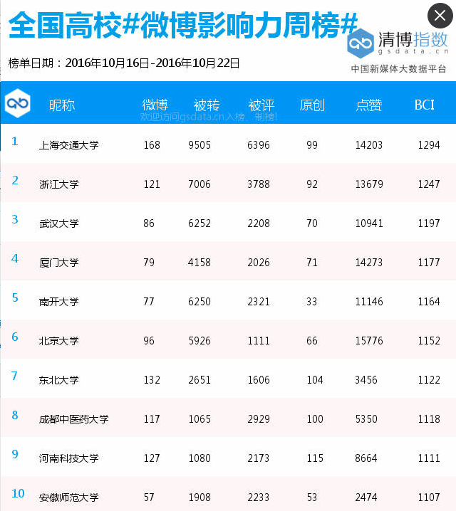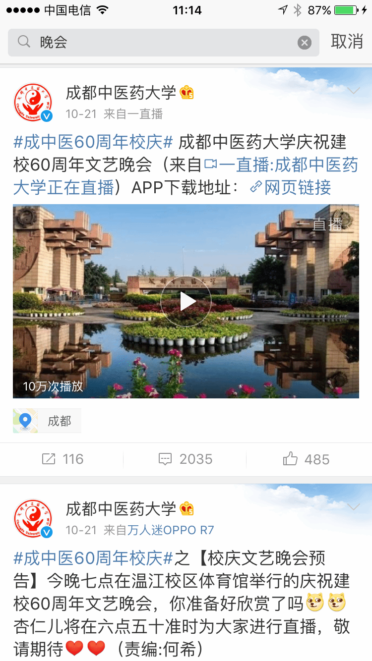 学校官方微博在全国高校微博影响力周榜中位居第八(2016.10.16—2016.10.22) 发布时间:2016-10-26 11:21:00 浏览次数: 次 【字体:小 大】 10月21日晚,学校官方微博直播了庆祝建校60周年文艺晚会,当晚收看直播人数达到10万人次,评论2035条, 转发116条。 (编辑/任翔) 【打印正文】 上一条:学校官方微博在全国高校微博影响力周榜中位居第八(2016.10.16—2016.10.22) 下一条:伟德成功承办首届国际中医药肿瘤论坛