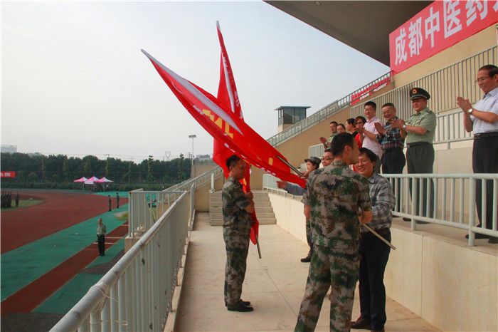 余曙光、彭成分别向军训旅一团、二团授旗。梁繁荣宣布2016级本专科学生军训开训!