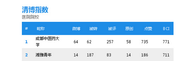 学校官方微博在医院院校微博影响力周榜中稳居首位(2016.4.17—5.07) 发布时间:2016-05-18 09:15:00 浏览次数: 次 【字体:小 大】 ( 编辑/任翔) 【打印正文】 上一条:学校官方微博在医院院校微博影响力周榜中稳居首位(2016.4.17—5.07) 下一条:学校学生在成都市第十三届运动会(成年组)武术比赛中喜获佳绩