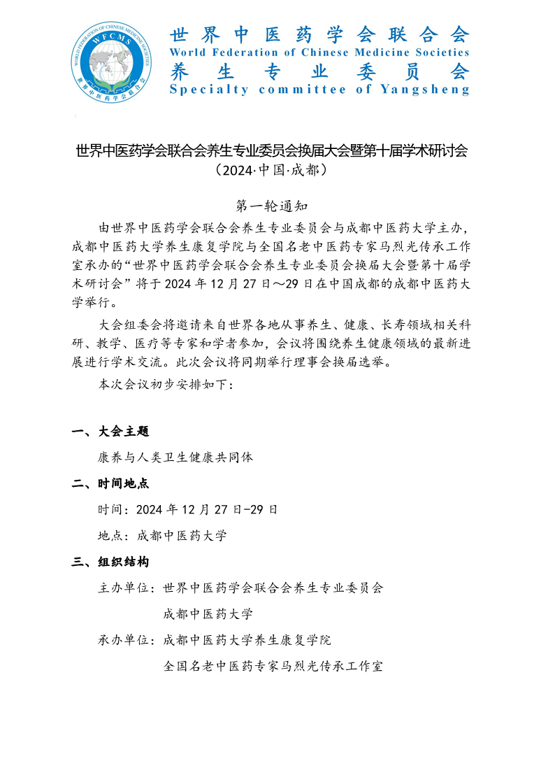 会议预告丨世界中医药学会联合会养生专业委员会换届大会暨第十届学术研讨会 发布时间:2025-06-06 12:07:31 浏览次数: 次 【字体:小 大】 主 题:康养与人类卫生健康共同体时 间:2025年6月6日(星期五)至8日(星期日)地 点:成都费尔顿大酒店三楼大会议室、温江校区弘景五号楼学术报告厅主 办:伟德源自英国1946 世界中医药学会联合会养生专业委员会承 办:伟德源自英国1946养生康复学院 中医药养生健康产业发展国家中医药管理局重点研究室 全国名老中医药专家马烈光教授传承工作室 成都中医大国医馆 【打印正文】 上一条:会议预告丨“一带一路”传统医学合作暨中医药现代化国际科技大会 下一条:会议预告丨科研思路与方法培训