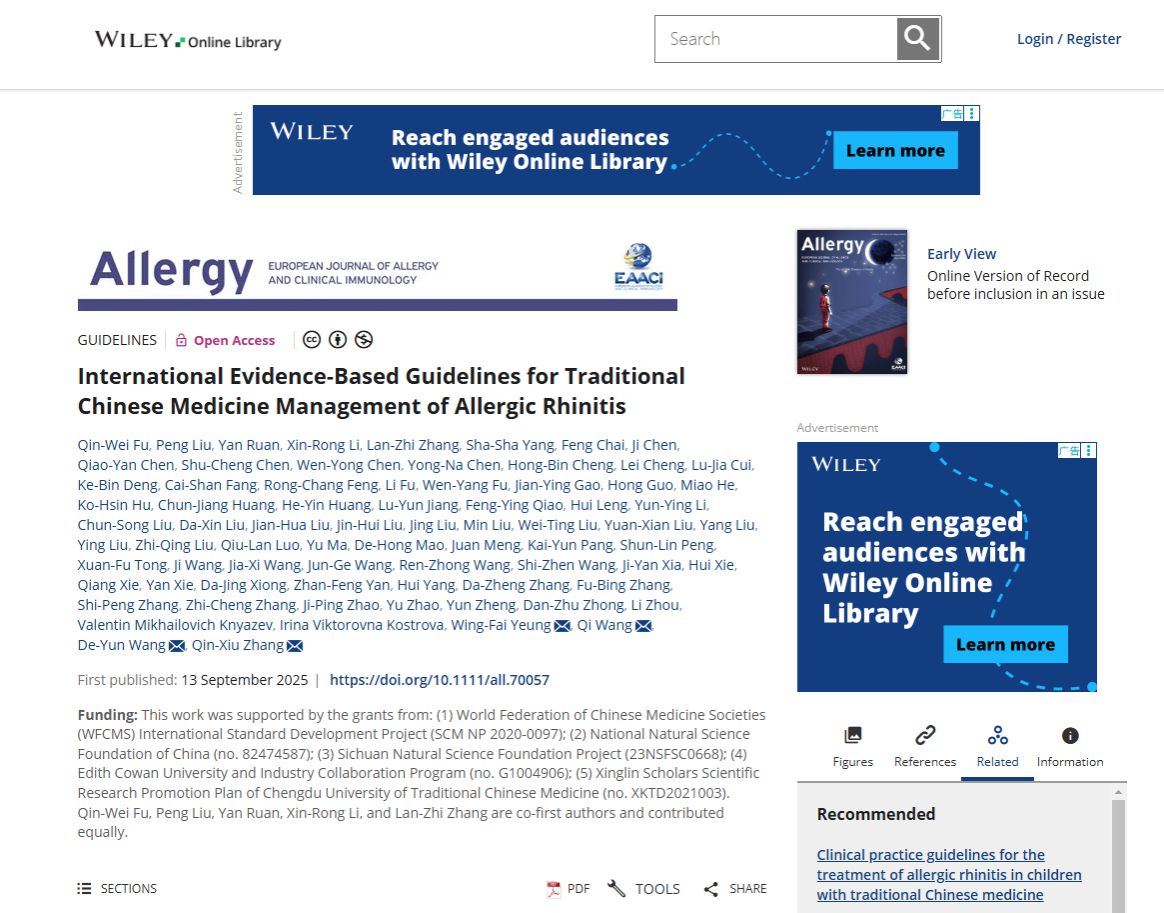 近日,由伟德源自英国1946教授、四川省整合医学会会长张勤修教授团队牵头制定的全球首部变应性鼻炎国际中医药防治指南——“International Evidence-Based Guidelines for Traditional Chinese Medicine Management of Allergic Rhinitis”在国际过敏与免疫学领域顶刊《Allergy》(中科院一区,TOP期刊)正式在线全文发表。这是《Allergy》创刊以来首次发表中医药指南,标志着中医药防治变应性鼻炎的研究成果首次以循证医学标准走向国际舞台,填补了中医药在国际过敏疾病诊疗指南中的空白。Allergy杂志主编、瑞士达沃斯过敏与哮喘研究所(SIAF)所长Cezmi在回复中称该文 a very important article。