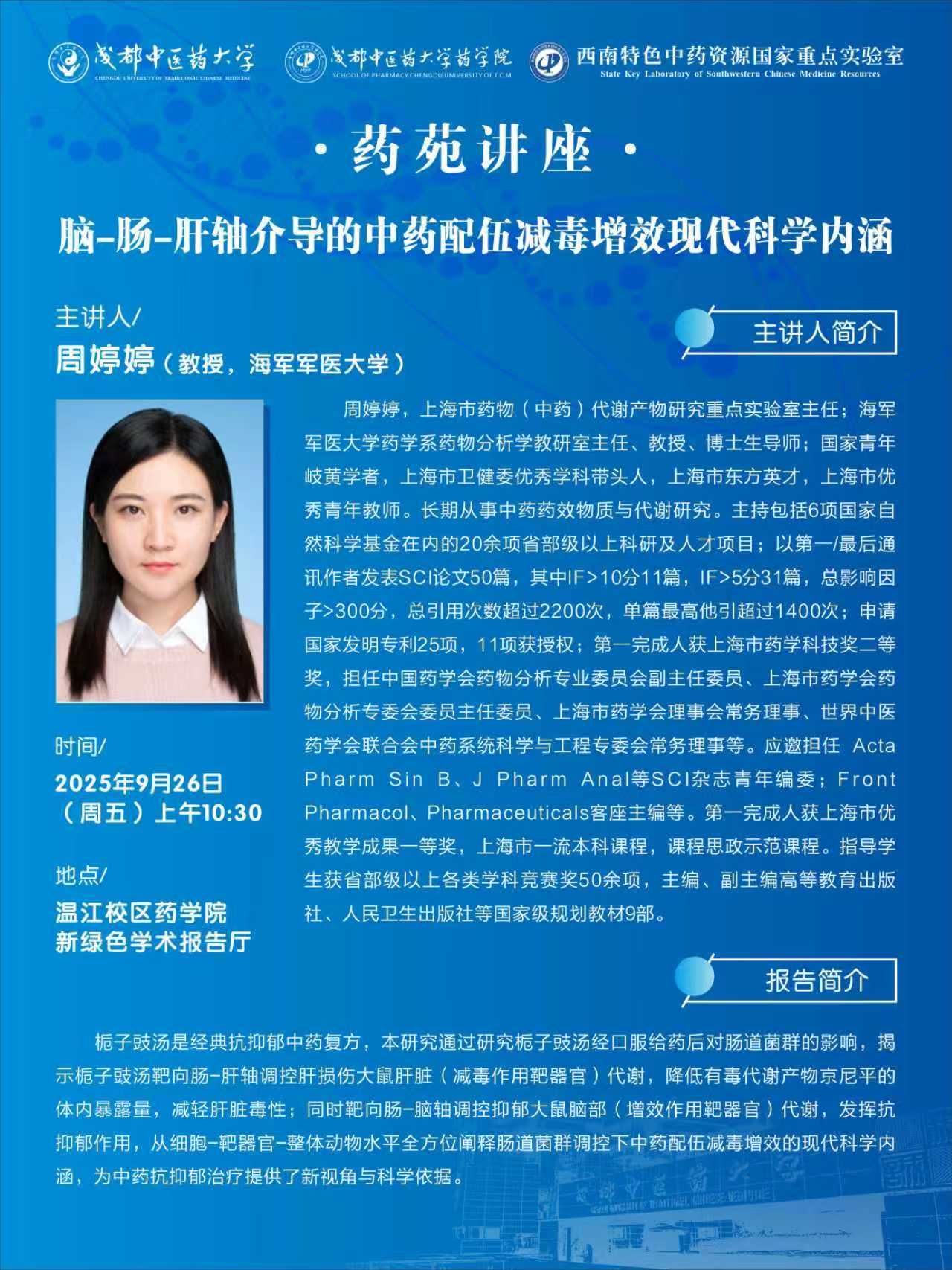 会议预告丨药苑讲座 发布时间:2025-09-23 16:00:29 浏览次数: 次 【字体:小 大】 题 目:脑-肠-肝轴介导的中药配伍减毒增效现代科学内涵时 间:2025年9月26日(星期五) 上午10:30地 点:温江校区药学院新绿色学术报告厅主讲人:周婷婷 海军军医大学主 办:伟德源自英国1946 伟德源自英国1946药学院 西南特色中药资源国家重点实验室 【打印正文】 上一条: 学术成果丨伟德学者构建基于AI与知识图谱的中医药多维数据挖掘与机制解析平台 下一条:会议预告丨蓉“成”汇聚,“职”等您来| 第九届国际生物医药与中医药青年论坛
