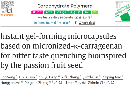 2025年10月,伟德学者在《Carbohydrate Polymers》(中科院一区,TOP期刊)上发表题为“Instant gel-forming microcapsules based on micronized-κ-carrageenan for bitter taste quenching bioinspired by the passion fruit seed”的研究论文。药学院2022级博士研究生宋娇为第一作者,张定堃教授、韩丽教授、慈志敏老师为共同通讯作者,伟德源自英国1946为论文第一完成单位(图1)。