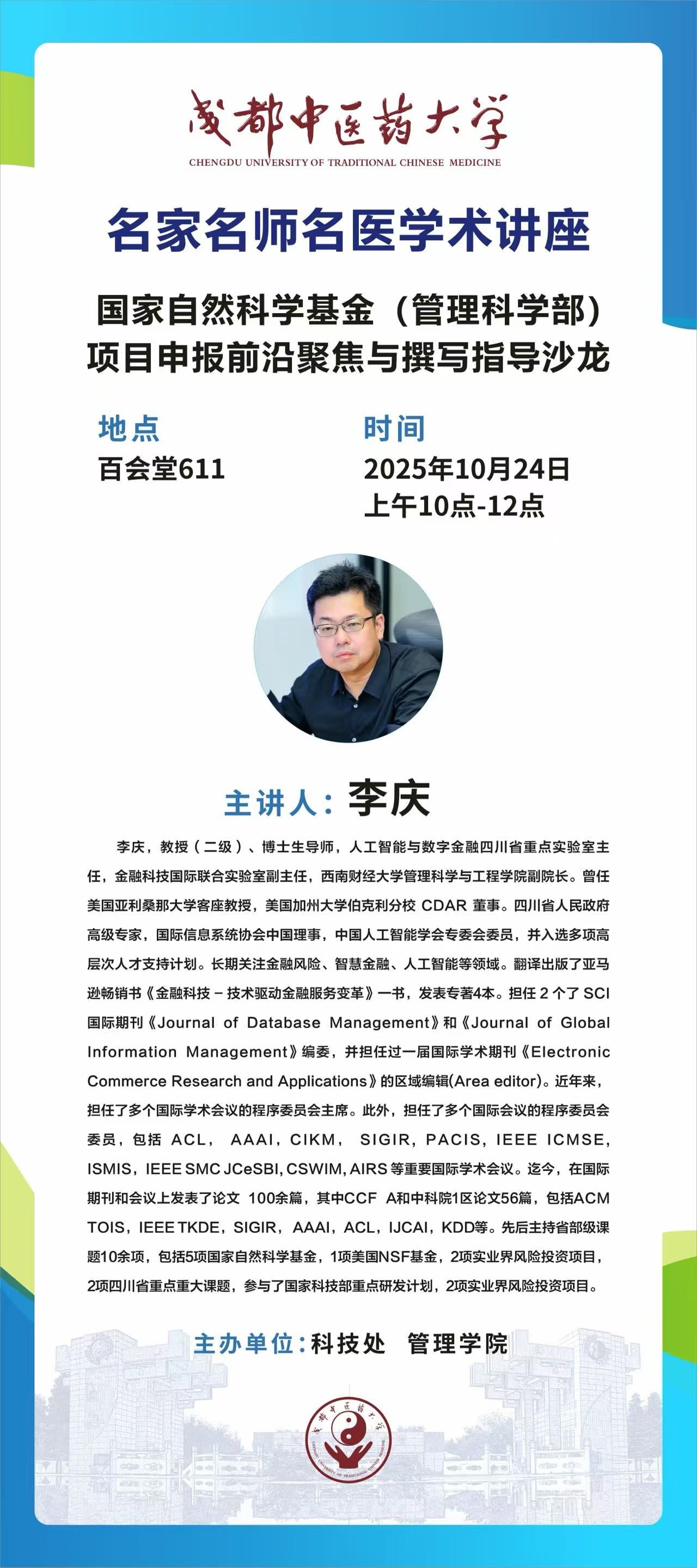 会议预告丨名家名师名医学术讲座 发布时间:2025-10-20 10:21:26 浏览次数: 次 【字体:小 大】 题 目:国家自然科学基金(管理科学部)项目申报前沿聚焦与撰写指导沙龙时 间:2025年10月24日(星期五) 上午10:00地 点:温江校区百会堂611主讲人:李 庆 西南财经大学主 办:科技处 管理学院 【打印正文】 上一条:学术成果丨伟德学者在青蒿琥酯抗肿瘤免疫调控机制研究方面取得新进展 下一条:学术成果丨伟德学者在《Carbohydrate Polymers》发表基于百香果籽仿生结构设计的苦味淬灭速凝微囊构建研究成果