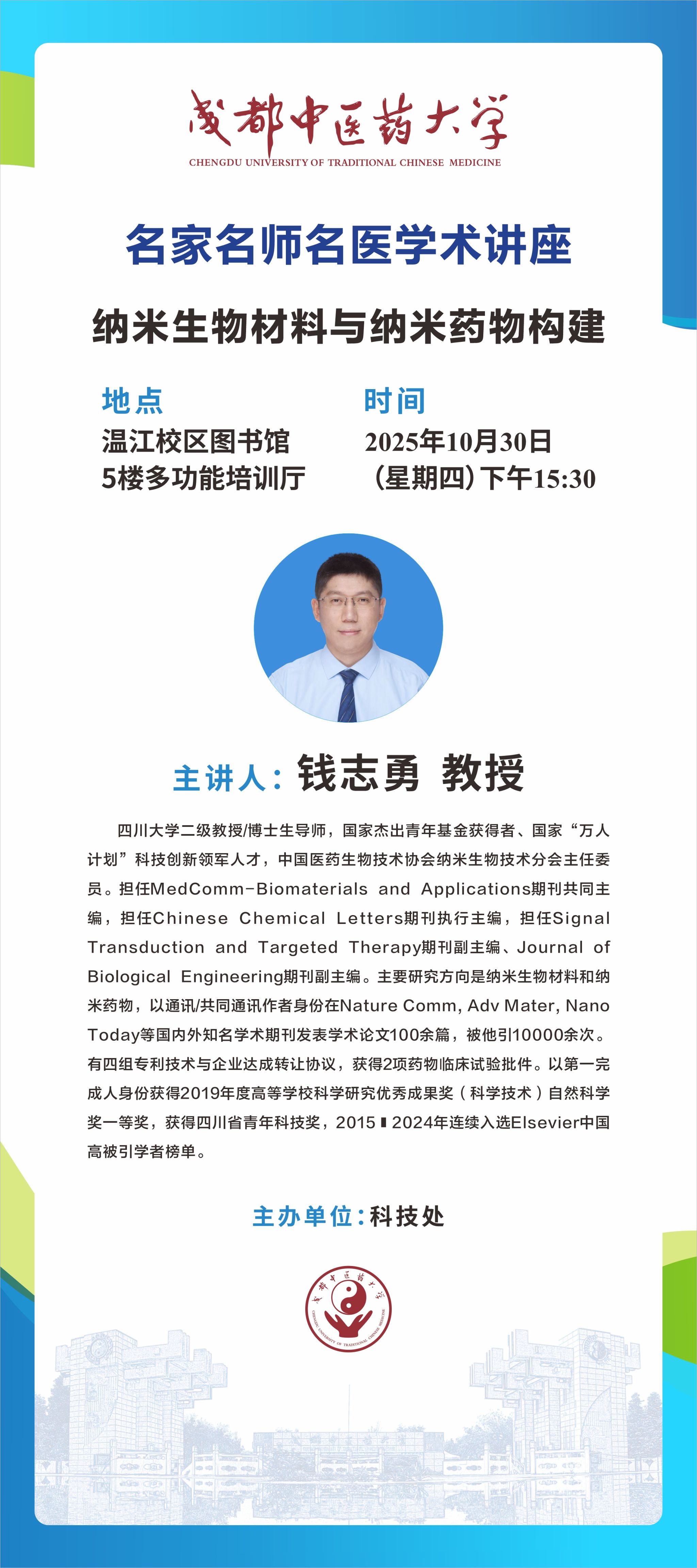 会议预告丨名家名师名医学术讲座:纳米生物材料与纳米药物构建 发布时间:2025-10-28 09:41:36 浏览次数: 次 【字体:小 大】 题 目:纳米生物材料与纳米药物构建时 间:2025年10月30日(星期四) 下午15:30地 点:温江校区图书馆5楼多功能培训厅主讲人:钱志勇 四川大学主 办:科技处 【打印正文】 上一条:会议预告丨名家名师名医学术讲座:器官芯片与药物研发 下一条:学术成果丨伟德学者在青蒿琥酯抗肿瘤免疫调控机制研究方面取得新进展