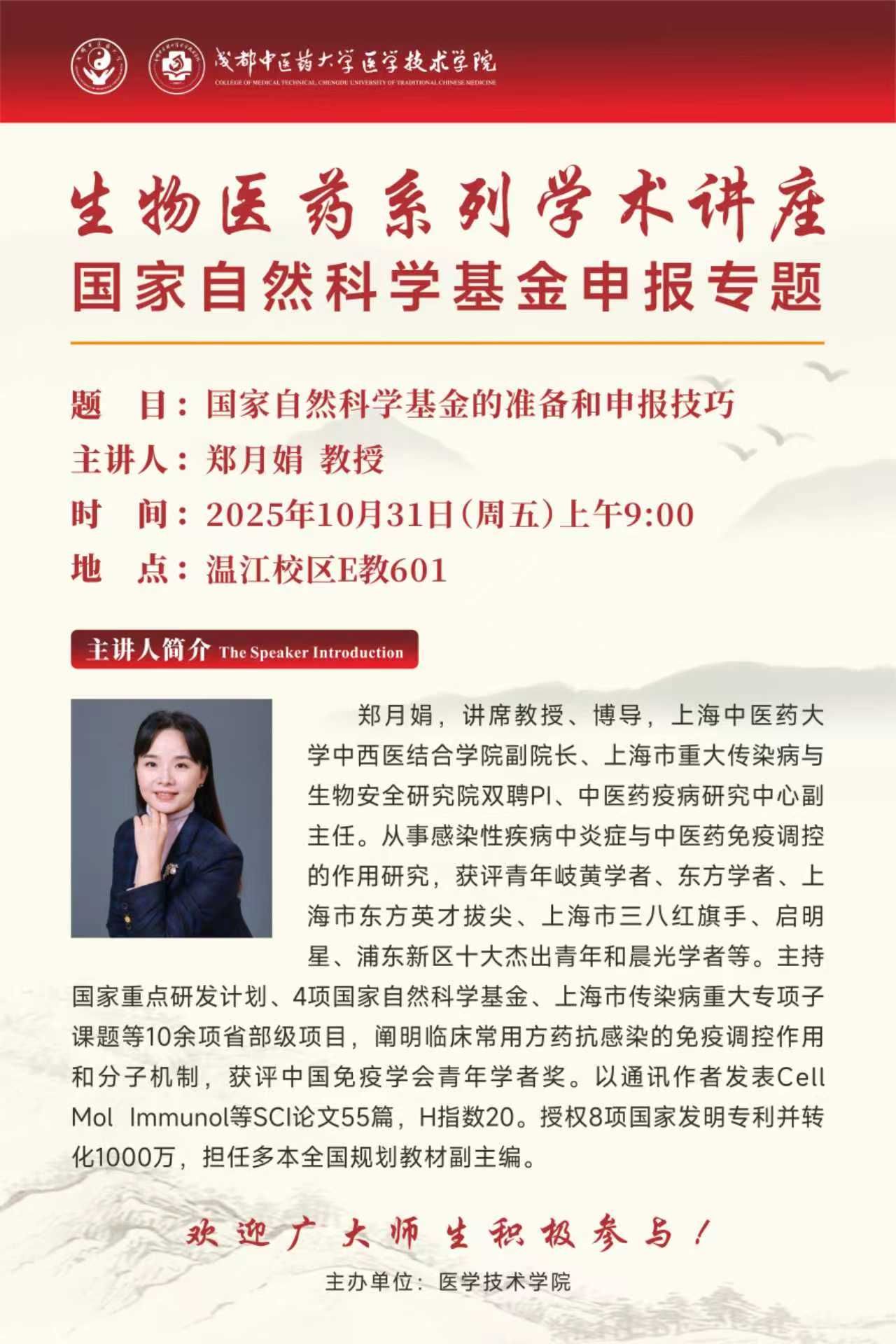 会议预告丨生物医药系列学术讲座 国家自然科学基金申报专题 发布时间:2025-10-31 08:37:44 浏览次数: 次 【字体:小 大】 题 目:国家自然科学基金的准备和申报技巧时 间:2025年10月31日(星期五) 上午09:00地 点:温江校区E教601主讲人:郑月娟 上海中医药大学主 办:医学技术学院 【打印正文】 上一条:会议预告丨名家名师名医学术讲座 伟德源自英国19462026年度国家自然科学基金申报科研思路与方法培训 下一条:会议预告丨名家名师名医学术讲座:器官芯片与药物研发