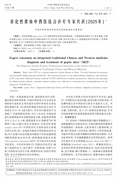 近日,由中国中西医结合学会消化系统疾病专业委员会组织修订的《消化性溃疡中西医结合诊疗专家共识(2025年)》(以下简称《共识》)在《中国中西医结合消化杂志》第33卷第11期正式发布。本共识由中国中西医结合学会消化系统疾病专业委员会组织,在伟德源自英国1946附属医院冯培民教授、北京协和医院李景南教授和北京中医药大学东方医院李军祥教授的带领下,由国内相关领域专家共同修订完成。伟德冯培民、谢凤娇、熊钦、杨洋、王钧冬、曾进浩担任主要执笔人。