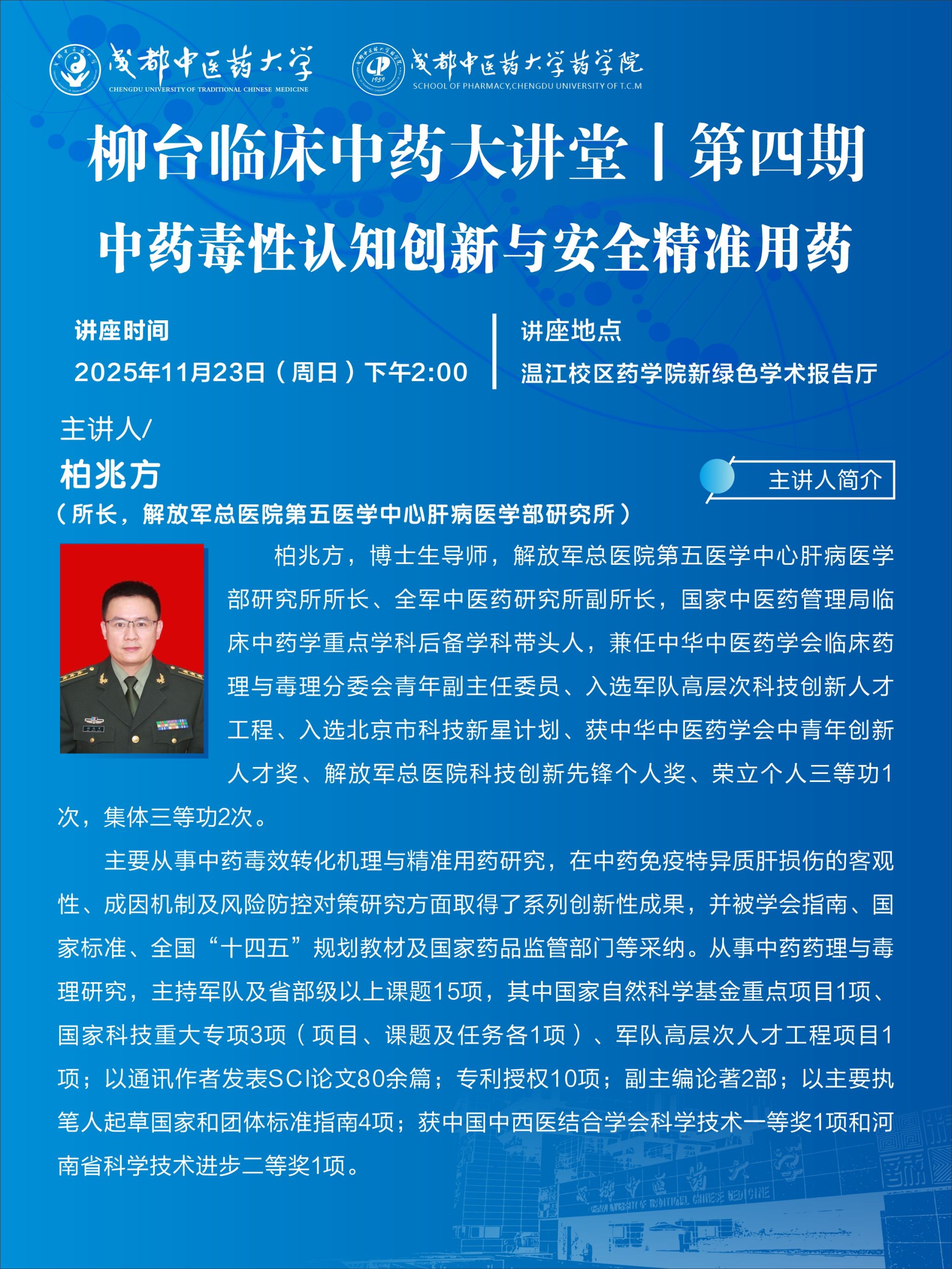 会议预告丨柳台临床中药大讲堂第四期 发布时间:2025-11-20 10:55:06 浏览次数: 次 【字体:小 大】 题 目:中药毒性认知创新与安全精准用药时 间:2025年11月23日(星期日) 下午14:00地 点:温江校区药学院新绿色学术报告厅主讲人:柏兆方 解放军总医院第五医学中心肝病医学部研究所主 办:伟德源自英国1946 伟德源自英国1946药学院 【打印正文】 上一条:学术成果丨伟德学者在设计构建选择性PI3Kγ抑制剂化合物库领域取得进展 下一条:会议预告丨四川省博士后学术交流活动暨第九届国际生物医药与中医药青年论坛