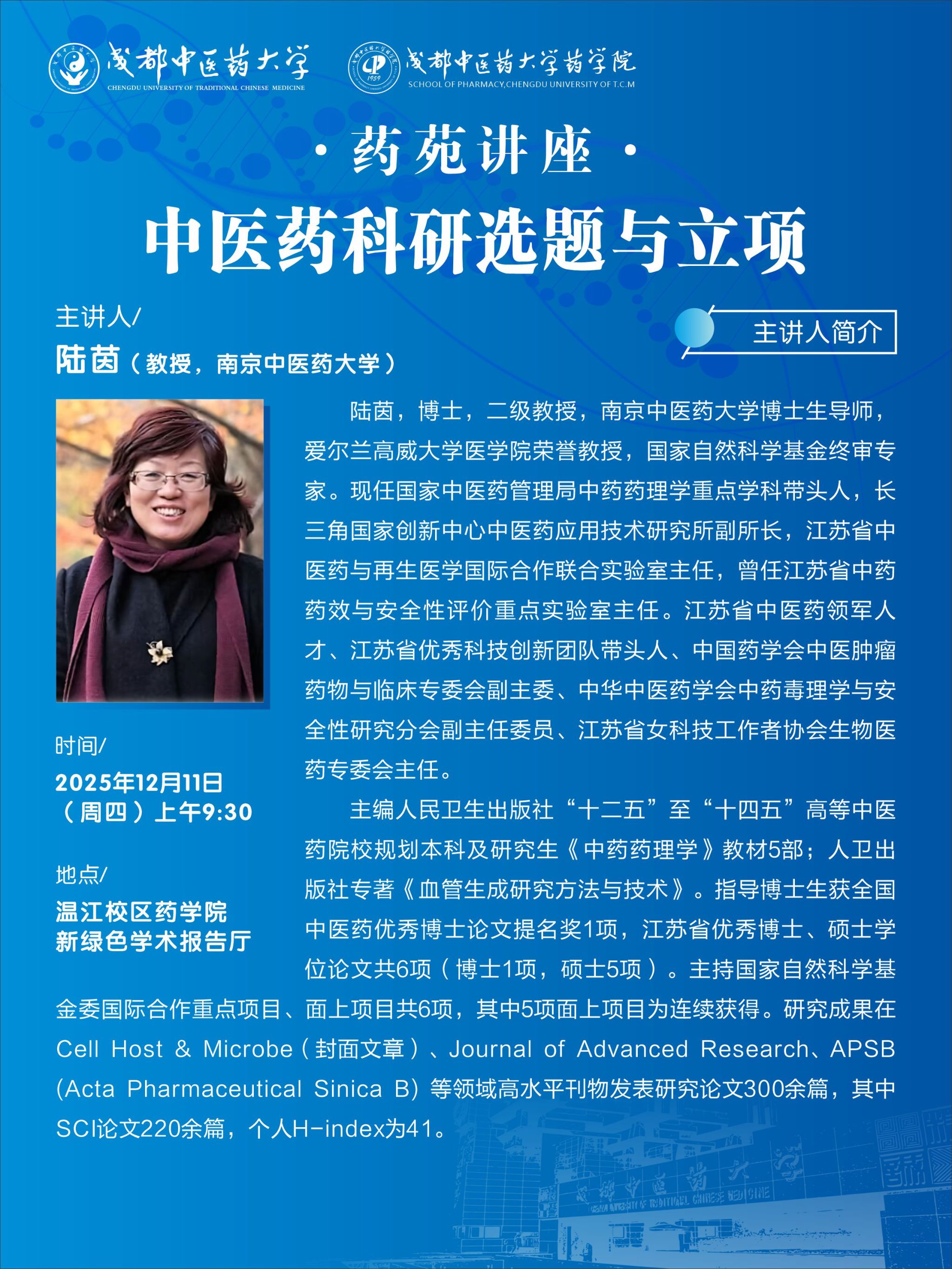 会议预告丨药苑讲座 发布时间:2025-12-08 15:25:58 浏览次数: 次 【字体:小 大】 题 目:中医药科研选题与立项时 间:2025年12月11日(星期四) 上午9:30地 点:温江校区药学院新绿色学术报告厅主讲人:陆 茵 南京中医药大学主 办:伟德源自英国1946 伟德源自英国1946药学院 【打印正文】 上一条:会议预告丨药苑讲座 下一条:会议预告丨名家名师名医学术讲座:国家自然科学基金(管理学部)项目申报的心得体会