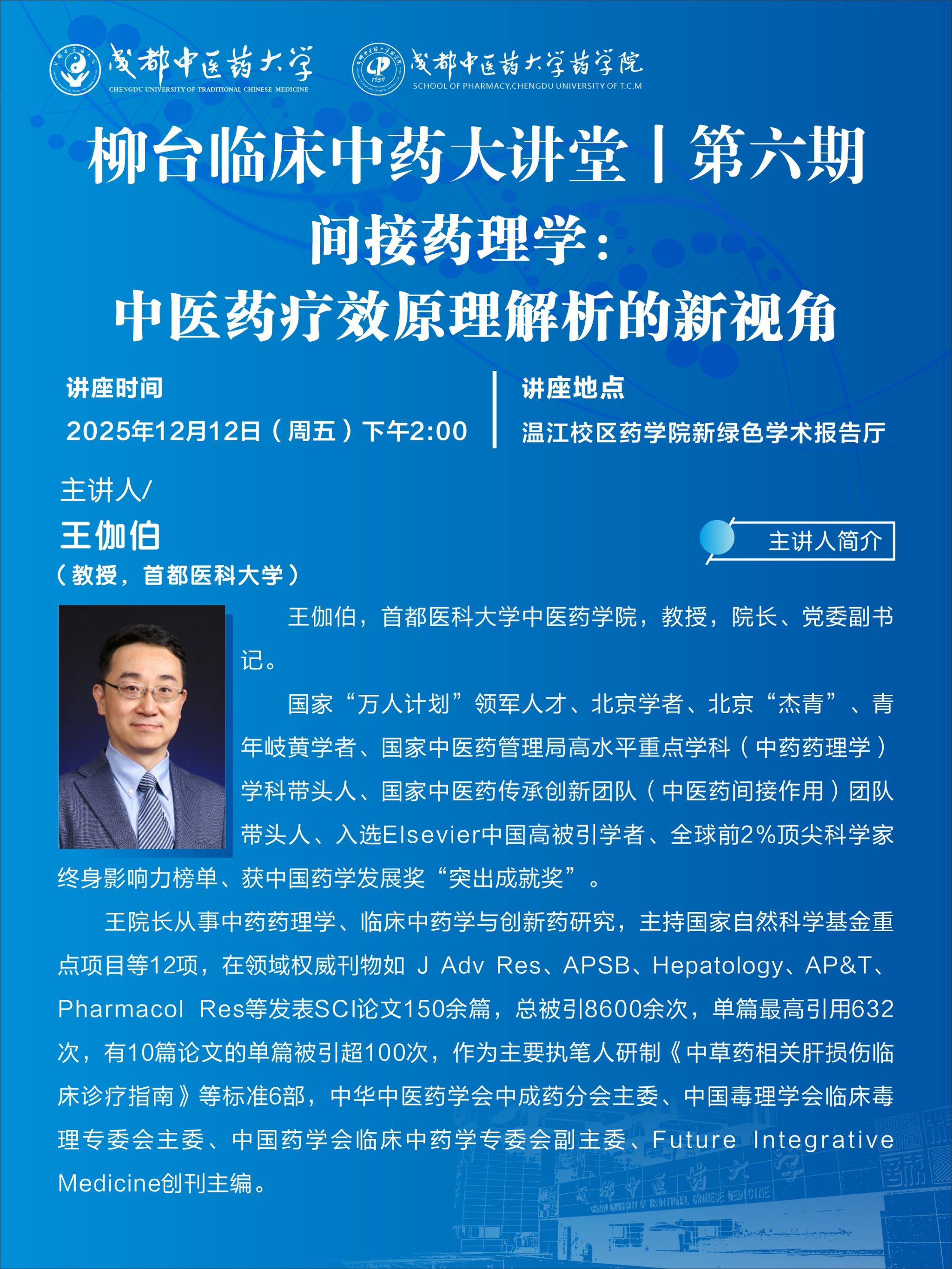 会议预告丨柳台临床中药大讲堂第六期 发布时间:2025-12-12 10:25:48 浏览次数: 次 【字体:小 大】 题 目:间接药理学:中医药疗效原理解析的新视角时 间:2025年12月12日(星期五) 下午14:00地 点:温江校区药学院新绿色学术报告厅主讲人:王伽伯 首都医科大学主 办:伟德源自英国1946 伟德源自英国1946药学院 【打印正文】 上一条:学术成果丨伟德学者在川芎水稻轮作内在机制解析系列研究中取得新进展 下一条:会议预告丨药苑讲座